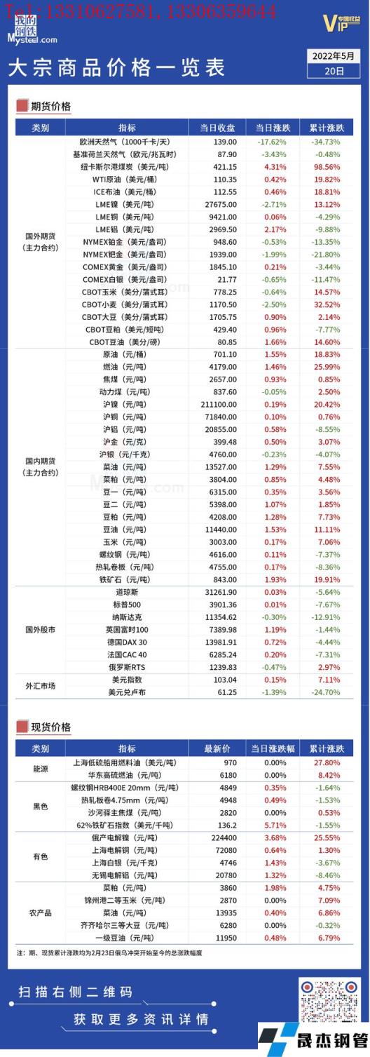 免責聲明:本網站(山東聊城晟杰無縫鋼管廠www.yztongfa.com)刊載的“俄烏局勢丨大宗商品價格一覽表(5月20日)”等均源于網絡,版權歸原作者所有,且僅代表原作者觀點,本文所載信息僅供參考。轉載僅為學習與交流之目的,如無意中侵犯您的合法權益,請及時聯系刪除。本網站刊登此篇文章并不意味著本站贊同其觀點或證實其內容的真實性,我們不對其科學性、嚴肅性等作任何形式的保證。如果侵犯了您的版權,請盡快聯系我們予以撤銷,謝謝合作!