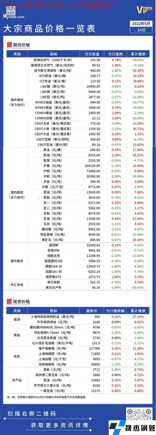 免責聲明:本網站(山東聊城晟杰無縫鋼管廠www.yztongfa.com)刊載的“俄烏局勢丨大宗商品價格一覽表(5月24日)”等均源于網絡,版權歸原作者所有,且僅代表原作者觀點,本文所載信息僅供參考。轉載僅為學習與交流之目的,如無意中侵犯您的合法權益,請及時聯系刪除。本網站刊登此篇文章并不意味著本站贊同其觀點或證實其內容的真實性,我們不對其科學性、嚴肅性等作任何形式的保證。如果侵犯了您的版權,請盡快聯系我們予以撤銷,謝謝合作!