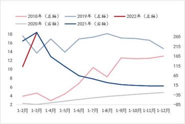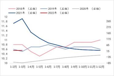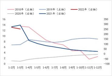 從基礎設施投資增速和房地產開發投資增速來看(涉及到對應年份走勢使用左右軸的區分目的與固定資產投資增速指標的說明一致),兩個指標在2020年-2021年非正常環境條件下的年份增速趨勢基本一致,但在正常環境條件下的年份增速可以看到,伴隨湖北省每年所需完成的經濟增長目標的大背景下,此兩項指標的增速表現呈現此消彼長的走勢。而結合斜率來看,進入2022年1-3月,基礎設施投資增速呈現明顯快速恢復或釋放態勢,而房地產開發投資增速則呈現明顯放緩態勢。由此看來,對于建筑厚壁無縫鋼管品種的需求將在房地產板塊的萎縮預期更為明顯,這與目前所處的房地產調控政策背景是相符的,即便有所改善,筆者認為仍暫難有實質上的新刺激,而基礎設施投資或將是托底的支撐因素之一。綜合來看,湖北省宏觀指標數據的預期演變表明對于建筑厚壁無縫鋼管品種的需求預期呈現萎縮態勢,這與產能角度的供應增加形成供需矛盾加劇的預期,因此這是導致建筑厚壁無縫鋼管價格偏低運行的外因之一。