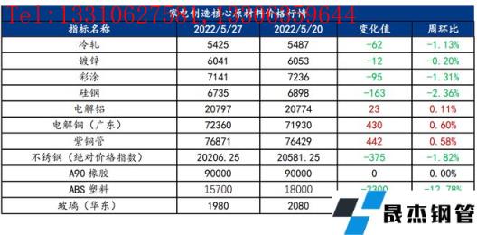 免責聲明:本網站(山東聊城晟杰無縫鋼管廠www.yztongfa.com)刊載的“家電原材料周報(5.23-5.27)”等均源于網絡,版權歸原作者所有,且僅代表原作者觀點,本文所載信息僅供參考。轉載僅為學習與交流之目的,如無意中侵犯您的合法權益,請及時聯系刪除。本網站刊登此篇文章并不意味著本站贊同其觀點或證實其內容的真實性,我們不對其科學性、嚴肅性等作任何形式的保證。如果侵犯了您的版權,請盡快聯系我們予以撤銷,謝謝合作!