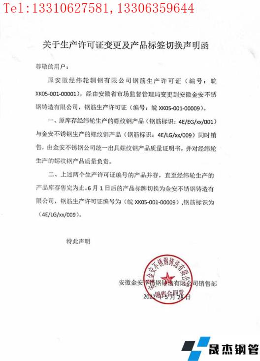 二、上述兩個生產許可證編號的產品并存,直至經緯輪生產的產品庫存售完為止。6月1日后的產品標牌切換為金安不銹鋼鑄造有限公司,鋼筋生產許可證編號為(皖XK05-001-00009),鋼筋標識為(4E/LG/xx/009)。