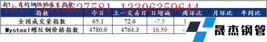 訊:全國(guó)建筑厚壁無縫鋼管成交量監(jiān)測(cè),成交量相對(duì)指數(shù)來看,全國(guó)65.1減7.5,北方53減11.9,華東81.7減3.1,南方55.2減9.5。今日螺紋鋼價(jià)格指數(shù)4780.9,較上一交易日增16.59。