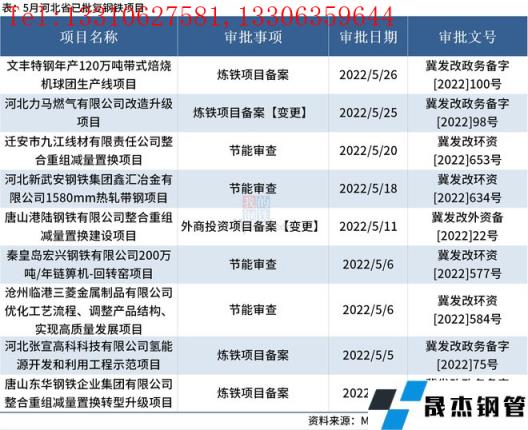 據(jù)不完全統(tǒng)計(jì),2022年5月河北省共批復(fù)鋼鐵相關(guān)項(xiàng)目9個(gè)。其中,有4個(gè)煉鐵項(xiàng)目備案(變更),4個(gè)鋼鐵項(xiàng)目節(jié)能審查和1個(gè)外商投資項(xiàng)目備案(變更)。