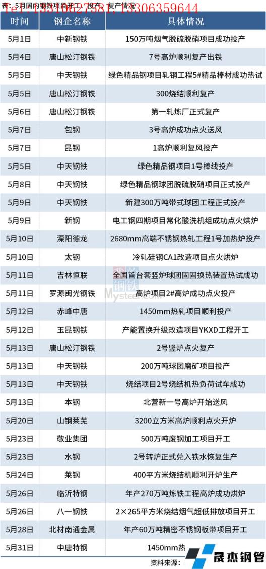 免責聲明:本網站(山東聊城晟杰無縫鋼管廠www.yztongfa.com)刊載的“5月國內29個鋼鐵項目開工、投產或復產”等均源于網絡,版權歸原作者所有,且僅代表原作者觀點,本文所載信息僅供參考。轉載僅為學習與交流之目的,如無意中侵犯您的合法權益,請及時聯系刪除。本網站刊登此篇文章并不意味著本站贊同其觀點或證實其內容的真實性,我們不對其科學性、嚴肅性等作任何形式的保證。如果侵犯了您的版權,請盡快聯系我們予以撤銷,謝謝合作!