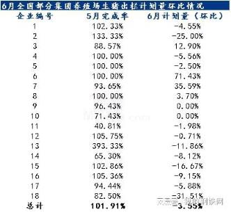據(jù)農(nóng)產(chǎn)品調研了解,針對18家集團養(yǎng)殖場全國生豬出欄情況來看,5月生豬出欄完成率總計101.91%,6月出欄量較5月實際出欄量環(huán)比下跌3.55%。