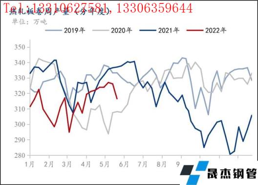 綜合來看,5月熱軋卷板行情整體呈現弱勢下行階段,近期震蕩磨底。基本面來看,產量方面下周沙鋼無縫厚壁鋼管廠家檢修會繼續維持,其余無縫厚壁鋼管廠家略有降負荷,但并沒有過多的產量影響,短期產量變化不大。
