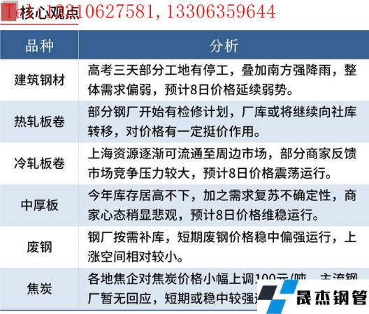 建筑厚壁無縫鋼管:6月7日,全國31個(gè)主要城市20mm三級抗震螺紋鋼均價(jià)4839元/噸,較上個(gè)交易日下跌15元/噸。高考三天,部分工地有停工,道路有封鎖,需求整體偏弱。疊加南方地區(qū)降雨天氣影響,整體需求仍然偏弱,因此預(yù)計(jì)8日國內(nèi)建筑厚壁無縫鋼管價(jià)格或?qū)⒀永m(xù)弱勢運(yùn)行態(tài)勢。