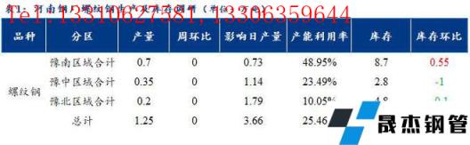 1、調研數據顯示,統計的河南地區10家建筑厚壁無縫鋼管樣本無縫厚壁鋼管廠家中,河南省建材無縫厚壁鋼管廠家螺紋鋼日產量1.25萬噸,產量較上周持平。檢修/限產影響建材日產量為3.66萬噸,產能利用率為25.46%。