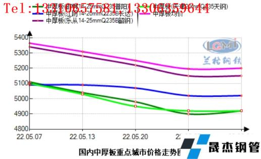 綜合來看,5月份國內中厚板市場價格整體呈現大幅下行的格局。截止5月31日,重點區域邯鄲價格為4920元/噸,環比下跌180元,江陰價格為5020元/噸,環比下跌90元,天津4920元/噸,環比下跌170元,樂從5150元/噸,環比下跌170元,目前樣本十大重點城市均價為5059元/噸,環比下跌161元左右。