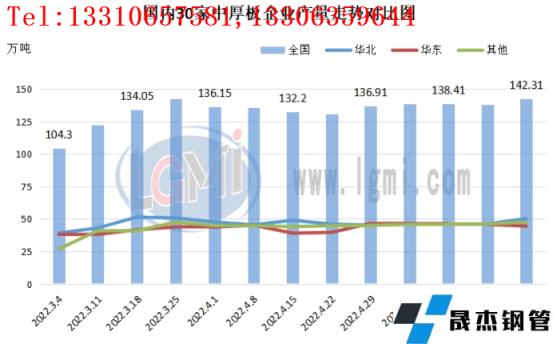 截止2022年5月27日,據云商平臺監測數據顯示,國內中厚板社會庫存量約為115.5萬噸,環比增加1.6萬噸左右,月同比增加10.4萬噸左右,年同比增加約2.9萬噸左右。5月份30家樣本鋼企庫存量呈現持續增長走勢,截止5月27日,追蹤國內30家中板鋼企庫存量約為46.6萬噸,與4月份相比基本持平,其中華北區域14家樣本企業廠內庫存約為22.7萬噸,同比4月份同期增加約5.5萬噸左右,華東區域12家樣本企業廠內庫存約為15.2萬噸,同比4月份同期下降約2萬噸左右,除華北、華東區域外,11家樣本企業廠內庫存約為8.7萬噸,同比4月份同期基本持平。