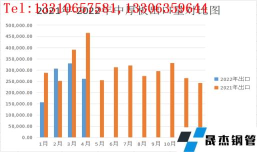至于出口方面,據不完全統計,2022年4月份國內中板出口量約為26.09萬噸,環比3月份出口量下降約6.94萬余噸,與2021年同期相比出口量下降約20.51萬噸左右,隨著國外市場復工復產節奏加快,中厚板品種對于國內資源依賴性逐步降低。