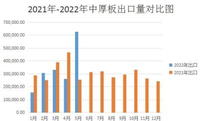 至于出口方面,據不完全統計,2022年5月份國內中板出口量約為62.84萬噸,環比4月份出口量增加約36.75萬余噸,與2021年同期相比出口量增加約37.29萬噸左右,因疫情得到有效控制,加之價格逐步企穩,積壓訂單明顯釋放。