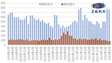 海關總署發布數據顯示,2022年6月份,我國出口厚壁鋼管755.7萬噸,同比增長17.0%;1-6月份累計出口厚壁鋼管3346.1萬噸,同比下降10.5%。6月份,我國進口厚壁鋼管79.1萬噸,同比下降36.8%;1-6月累計進口厚壁鋼管577.1萬噸,同比下降21.5%(詳見圖1)。
